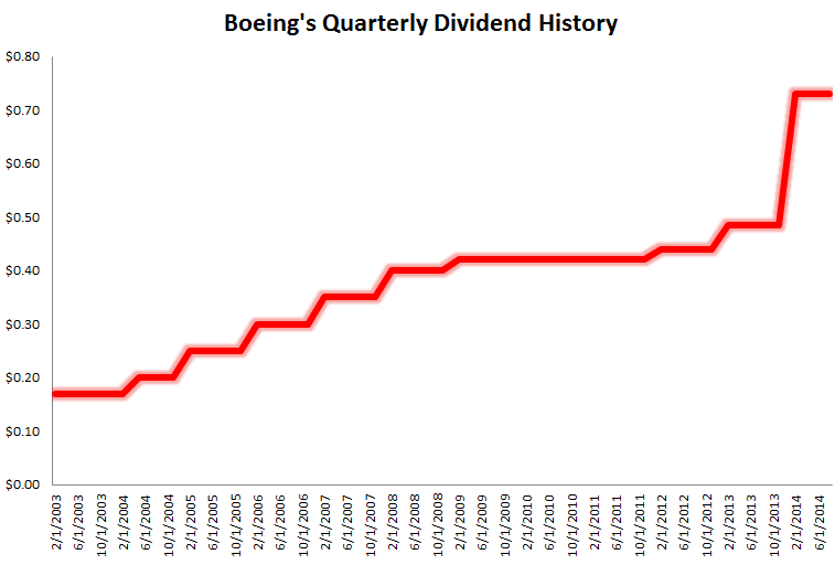On top of Boeing offering investors plenty of revenue transparency in the years ahead, as well as a market expected to expand globally over the next 20 years, the stock also boasts a solid dividend to return more value to shareholders. As you can see below, Boeing has consistently hiked its dividend over time and hasn't been afraid to surprise investors with a larger-than-expected increase.