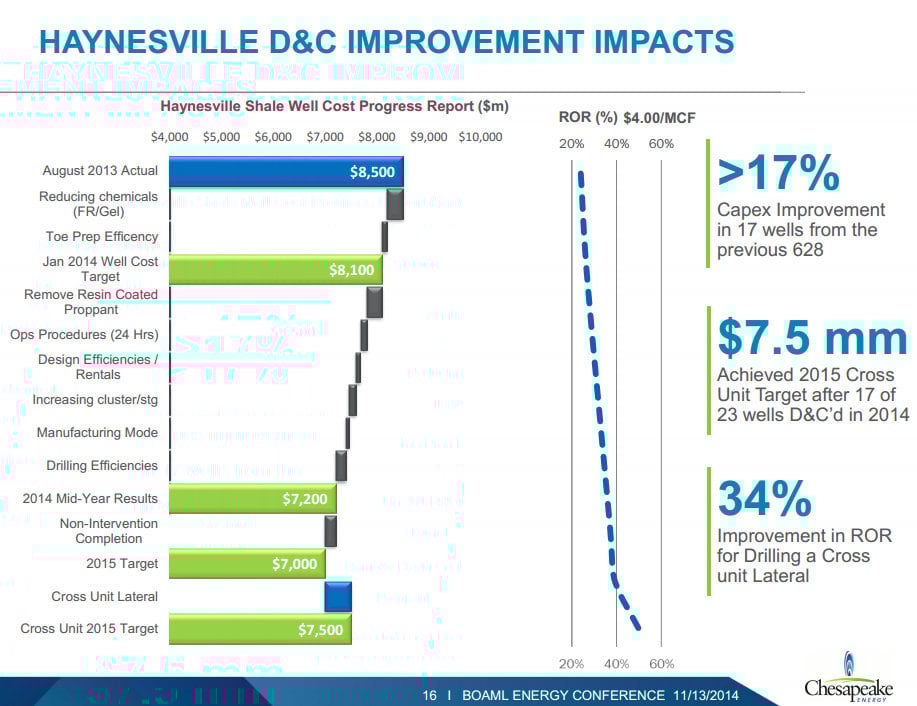 Another big driver for the company is its ability to improve the rate of return it earns on each new well it drills. The company is seeing compelling returns from these additional investments by drilling cross-unit laterals in each well. This type of approach helps the company to increase lateral lengths and access resources that might have otherwise been left undeveloped. As the following slide illustrates, the company has shaved $1.5 million off its well costs in the Haynesville shale over the past year, but has reinvested $500,000 per well into cross-unit laterals.