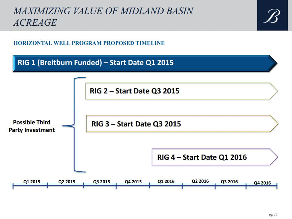 Ideally, these partner-funded rigs would be structured in such a way that it would make the horizontal wells more MLP-friendly by providing steady cash flow while minimizing the production decline. On the company's last conference call, CEO Hal Washburn noted that BreitBurn has several options to participate in the upside from drilling these wells , while mitigating the downside that comes from the steep decline rate.