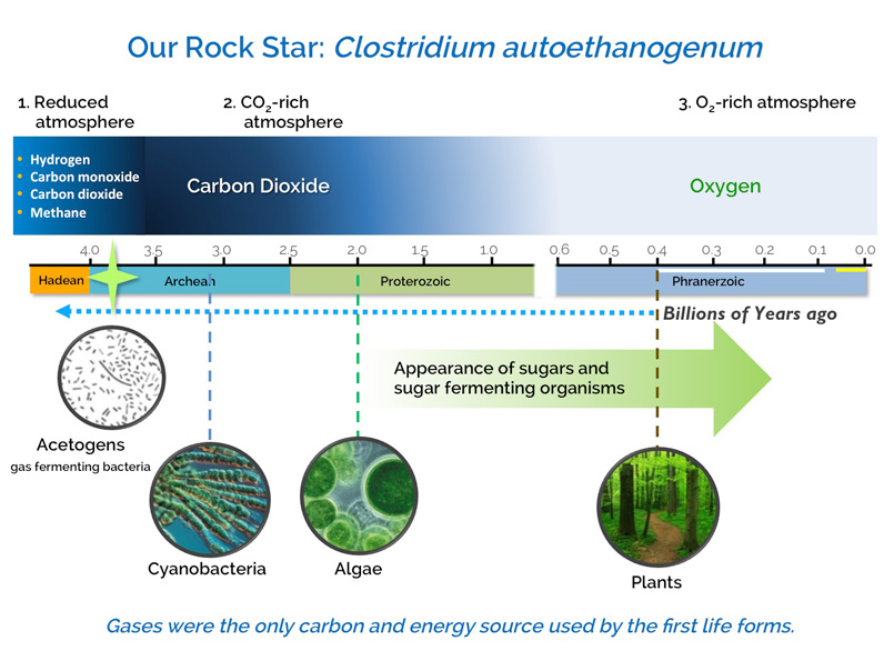 Many of the first life forms to arise on Earth didn't get energy from consuming sugars (there weren't any) or oxygen (there wasn't much) or sunlight (good luck piercing through the thick atmosphere!) -- metabolisms typically associated with familiar microbes today such as E. coli, yeasts, and algae. Instead, early microbes worked with what was available, which happened to be high concentrations of reduced gases such as carbon dioxide, carbon monoxide, methane, and hydrogen -- the same troublesome gases industrial processes produce today.
