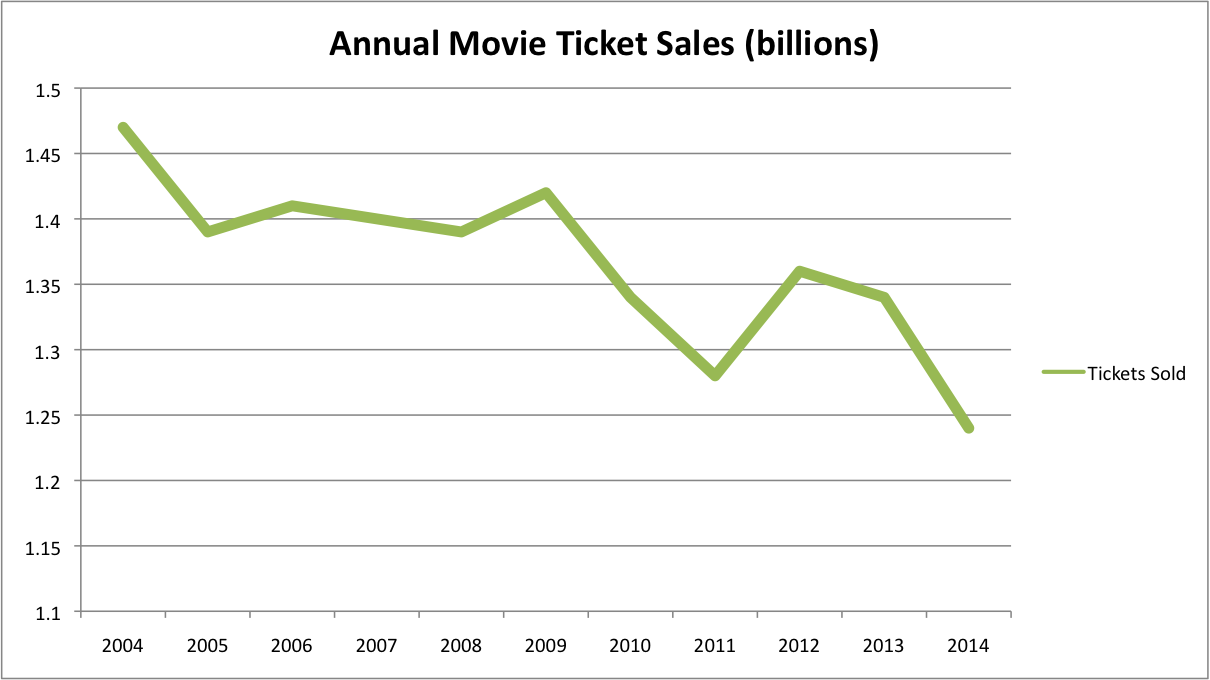 Moviegoers aren't rolling out the red carpet anymore for theaters. No doubt a combination of higher prices and weaker plot lines are conspiring to kill sales. 2014 data annualized. Data: The Numbers.