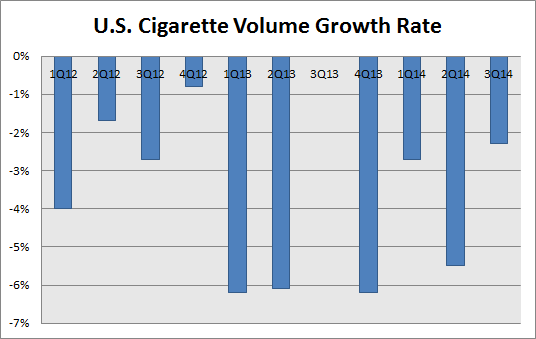 Moreover, recent evidence suggests cigarette volumes are stabilizing in the U.S. After a big decline in 2013, industry executives are seeing a return to low single-digit decline rates. In its third-quarter earnings call, Reynolds American estimated that industry cigarette volume was down just 2.7% compared to the same quarter in 2013. "Industry volumes moderated. We're looking now at about 3.5% [decline] for the year," said Reynolds American CEO Susan Cameron. That's much better than U.S. cigarette volume's 4.6% fall in 2013.