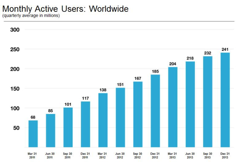 Fortunately, Twitter's long-term user growth has been impressive, with monthly active users, or MAUs, surging from 68 million in March 2011 to 241 million at the end of 2013.