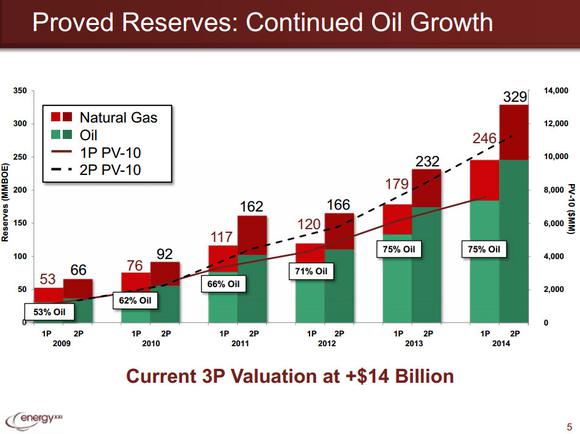 What this slide is suggesting is that Energy XXI is sitting on as much as three times more oil and gas in the ground than its current value would indicate. That's of course if we ascribed full value for possible and probable reserves, which are less certain than proved reserves. Further, it also assumes a much higher oil price than what we're seeing just a few months later. Still, factor all of that into the equation and we're still looking at a company sitting on substantially more oil and gas reserves than the current stock price would suggest, which would seem to scream value.