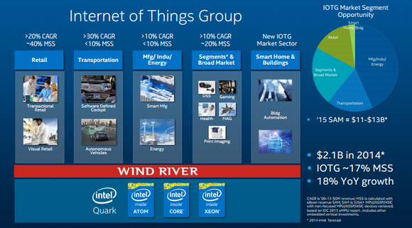 According to Davis' presentation, Intel's served addressable market from a silicon perspective in the "Internet of things" will be somewhere between $11 billion and $13 billion during 2015. In that same presentation, Davis noted that Intel is on track to generate about $2.1 billion from this market, which comes out to approximately 17% market segment share.