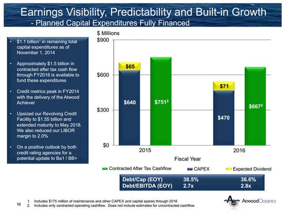All that being said, not all offshore drilling dividends appear to be at risk. Atwood Oceanics (ATW +0.00%) just started paying a quarterly dividend this fall, and it's important to note that the company is starting small with an easy-to-manage plan of increasing the payout by 10% per year. That plan is backed by a very strong contract backlog that is expected to produce $1.5 billion in after tax cash flow over the next two years, which is more than enough to cover the company's $1.1 billion remaining capex requirements for its newbuild drillships. As we see on the following slide, the company's dividend is well covered.
