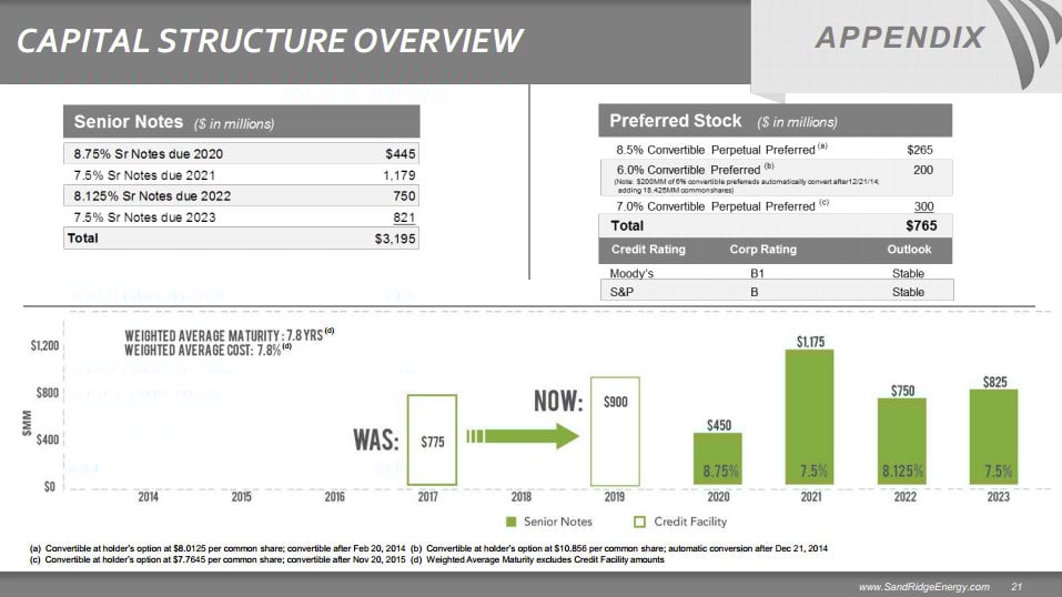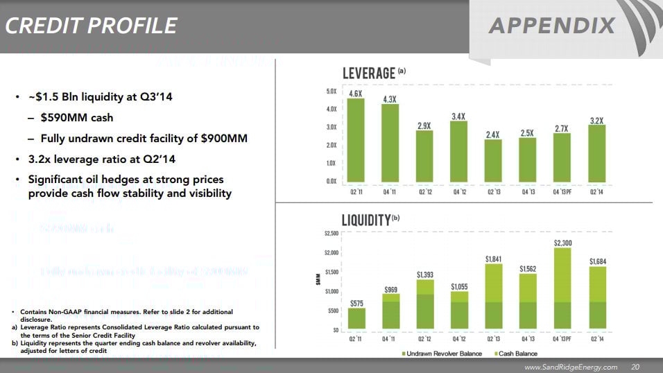 A potential drop in cash flow would increase the company's leverage ratio even further. This means SandRidge's liquidity might one day be reduced if the company's credit facility is reduced. A rash of bankruptcies among smaller shale drillers could cause banks to tighten up credit availability for highly levered energy companies.