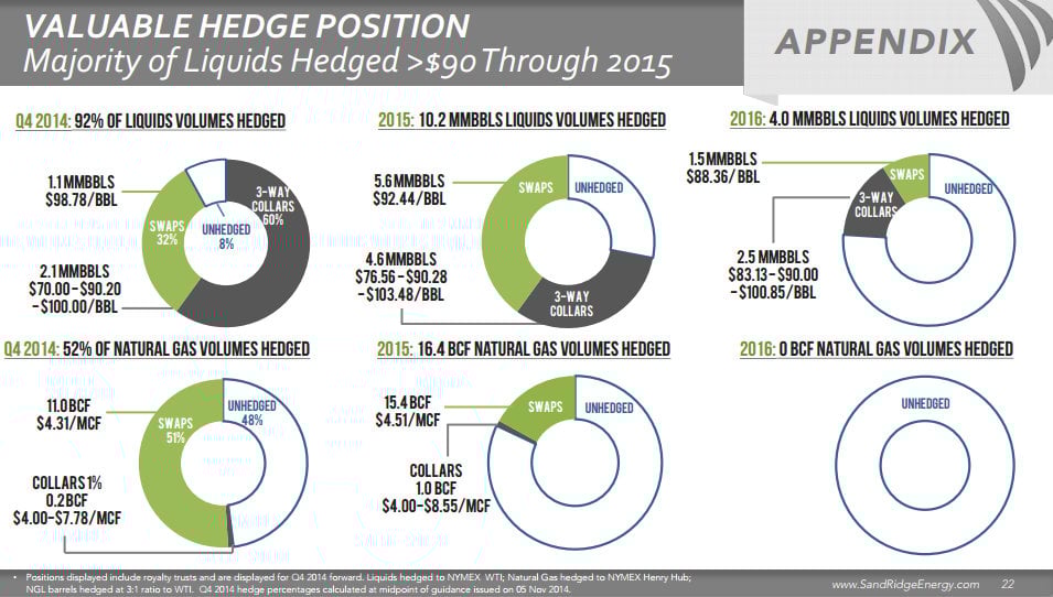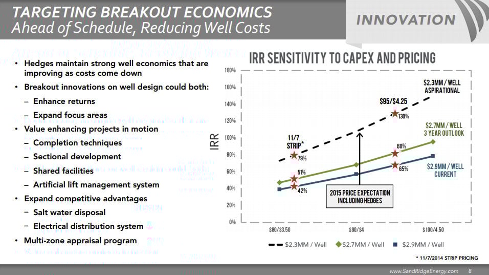 That rather robust hedge position insulates the company against plunging oil prices -- to a point. It's that point that has investors fretting. As that slide shows, 8% of the company's production through the end of 2014 is unhedged, which is an issue when oil prices tumble. Another concern is one of the methods the company uses to hedge: 60% of its oil volume is hedged using three-way collars. These protect 100% of the fall in the price of oil from $90.20 per barrel to $70 per barrel when it comes to SandRidge Energy's specific collars. But when oil prices fall below $70, some of the protection begins to erode. For example, if oil prices fall to $65 per barrel, instead of netting $90.20 per barrel the company would have to settle for $85.20. The farther oil prices fall the less protected SandRidge is against that fall, which is a growing concern as oil prices have yet to find a bottom having recently dropped to $65 per barrel.