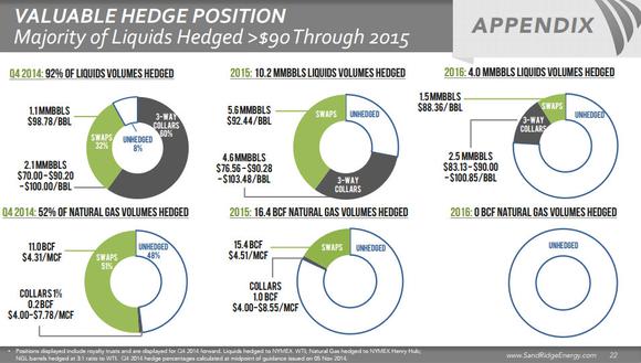 Oil is the biggest driver of SandRidge Energy's economics -- before oil prices fell from the $100 per barrel average over the past three years it was fueling 80% of the company's cash flow out of the Midcontinent. So investors worry when oil prices fall. That said, 92% of SandRidge's oil production is hedged through the end of this year, with very solid hedges in place for 2015, as shown on the following slide.