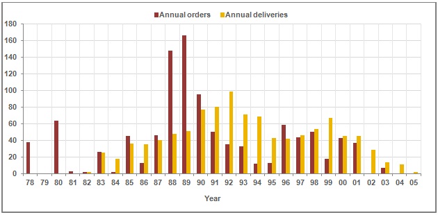 Orders and deliveries of Boeing 757, chart by author, Data source: Boeing
