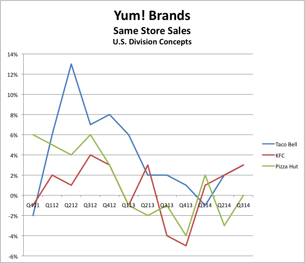 Business has turned up for Yum! Brands in recently, but performance has been erratic. Data: Yum! Brands quarterly SEC filings.