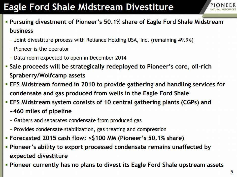 Pioneer Natural Resources announced two plans to bolster its balance sheet in light of falling oil prices when it reported third-quarter results early last month. First, the company announced a billion-dollar equity offering, which it closed in early November. The second step in the process is to divest its share of a joint venture that owns Eagle Ford shale-related midstream assets. As the following slide notes, the data room for this asset was not expected to open until December, suggesting a sale won't come soon.