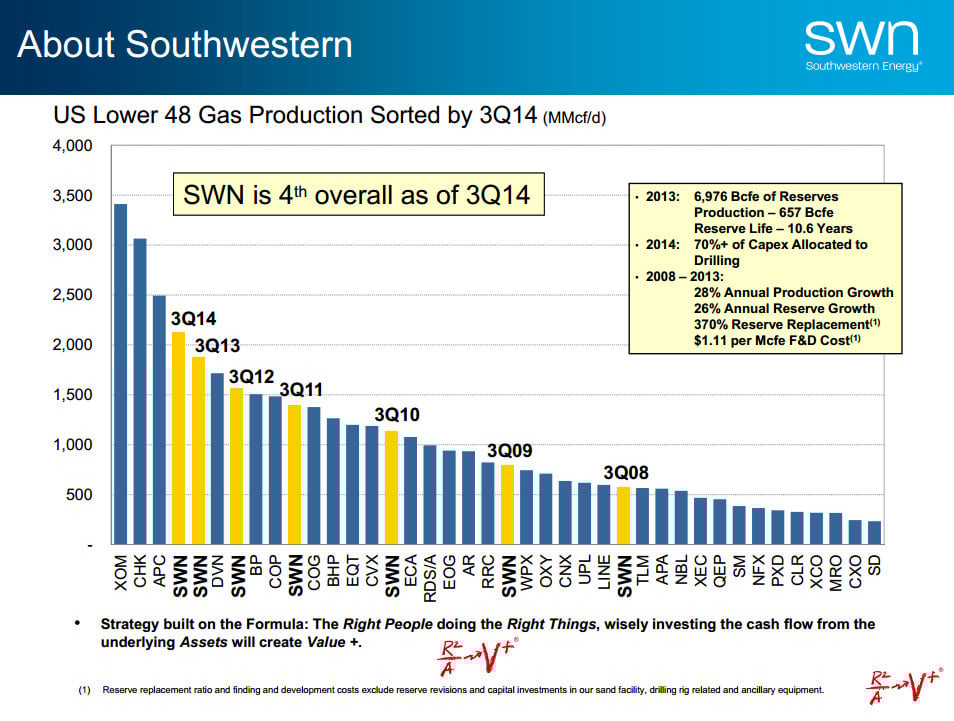 This has opened the door for Southwestern Energy to begin to emerge as America's new natural gas growth leader. The company has aggressively grown its natural gas production as this year it spent $2.4 billion to push its production up 16%. The company has also aggressively acquired natural gas assets from rivals. In the Chesapeake Energy deal, for example, it added a third growth asset to its natural gas portfolio to go along with the Fayetteville shale as well as the northern Marcellus shale. Going forward each asset is expected to produce a third of the company's future production with the southern Marcellus acreage from Chesapeake expected to provide the company with about two decades worth of drilling inventory.