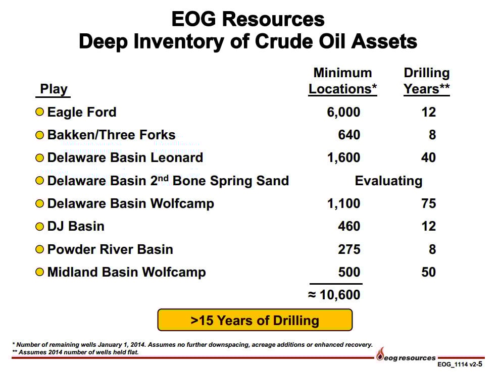 What this chart suggests is that EOG Resources might choose to hold off on drilling new wells in places like the Wyoming DJ Basin Niobrara or the Midland Basin Wolfcamp for the time being. Instead, the company could chose to focus more of its attention, and capital, on the Eagle Ford, Bakken and Delaware Basin plays. As this next slide notes the company has ample drilling inventory across those plays to keep it busy while it waits for higher oil prices.
