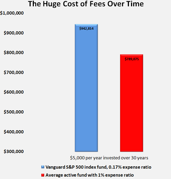 This is the dirty secret of the mutual fund industry. Mutual funds and ETFs -- exchange-traded funds -- charge fees called expense ratios, and these expense ratios can range from the very low 0.17% Vanguard 500 Index Fund (VFINX +0.11%), to more than 2% per year. Since you never see a bill for this fee -- the fund managers take it out of the fund's assets every year -- this hidden cost is easily overlooked but can reduce your returns by tens of thousands of dollars.