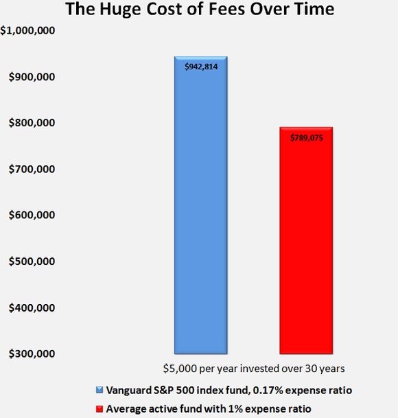 Here's how much a 1% expense ratio can take out of your returns, as compared with a low-cost index fund, assuming same performance: