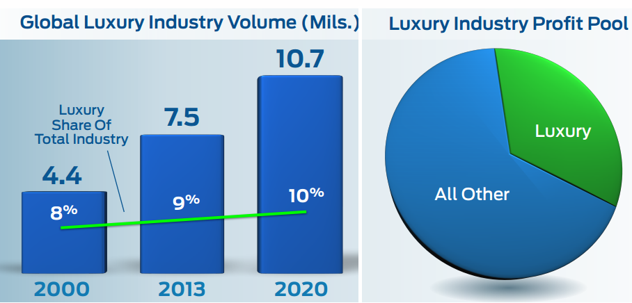 Despite the luxury segment representing less than 10% of sales in the U.S. last year, it represents roughly 30% of the industry's profit pool, according to Ford. That's a big deal.