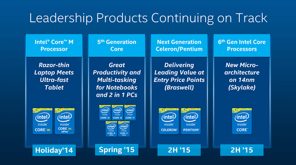 At the Intel (INTC 2.53%) investor meeting this year, the company disclosed that it would be launching its low-power Broadwell processors in "early spring." Interestingly enough, Kirk Skaugen, who heads up Intel's PC Client Group, showed the following product roadmap for the company's PC-oriented processors: