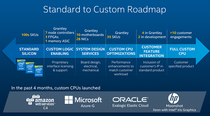 Intel claims that it has integrated external customer IPs into four custom versions of the latest "Grantley" products, with two more in development. It also claims that it is engaged with more than 10 customers to build full custom CPUs based on customer requests.