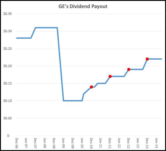 If you take a second look at the chart above, you'll see the red markers coincide with an important period in each of the last four years for GE: the month of December. These are the months in which the company "declared" a dividend increase, illustrated by the uptick in the line graph.