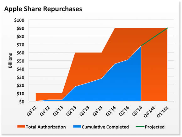 At last count, Apple had repurchased a cumulative total of almost $68 billion, leaving just $22 billion of its current $90 billion authorization. Over the past six quarters, Apple has repurchased $11 billion on average (including the occasional accelerated share repurchase program).