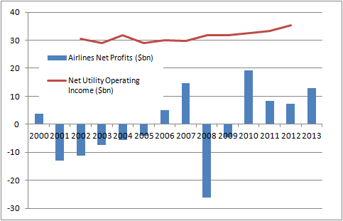 Rising energy prices helped to hold back investment by U.S. utilities, while the global airline industry (also reeling from 9/11) was only profitable for two years during 2001-2009.