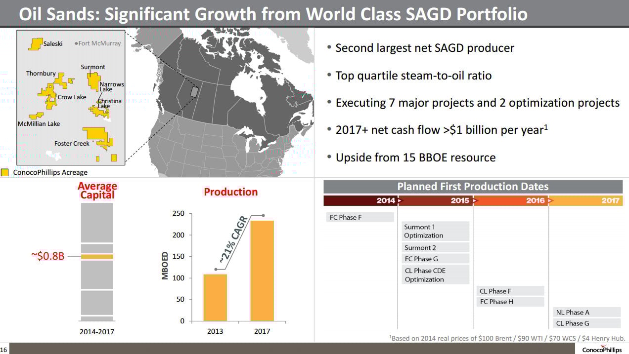Meanwhile, spending on major projects will be cut by $1 billion to $4.8 billion. However, this was always part of the plan, as 2014 was the company's spending peak for major projects, including APLNG and Surmont Phase 2. The company plans next year to complete those two projects, while also investing in major projects in Alaska, Europe, and Malaysia.