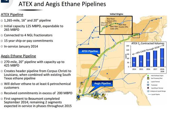 These pipelines will connect the hyper prolific Marcellus and Utica shale with petrochemical plants on the Gulf coast. The Atex pipeline is expected to see contracted volume increase 130% by 2018 and with 15 year ship-or-pay contracts -- meaning Enterprise is paid for capacity even if customers don't transport ethane. However, Enterprise isn't stopping at ethane.