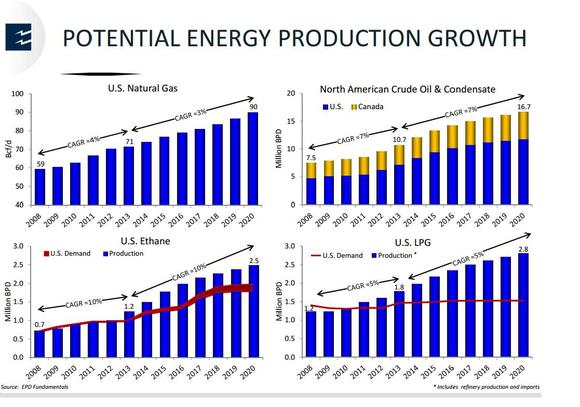 A good example of how Enterprise maximizes several avenues of growth synergistically is with NGLs. NGL production is expected to increase 79% by 2020 courtesy of America's incredible growth in gas production (from which NGLs are separated) and strong export demand from Europe and Asia.This large increase in NGLs provides several growth catalysts for Enterprise.