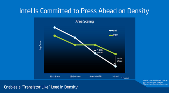 Intel's chart was, as we found out this year, based on the metric of gate pitch multiplied by minimum metal pitch (both key determinants of theoretical process density). TSMC's 16-nanometer process offers a gate pitch of 90-nanometers and a minimum metal pitch of 64-nanometers, per its paper at IEDM 2013. Intel's 14-nanometer process offers a 70-nanometer gate pitch and a 52-nanometer minimum metal pitch, according to disclosures by the company.
