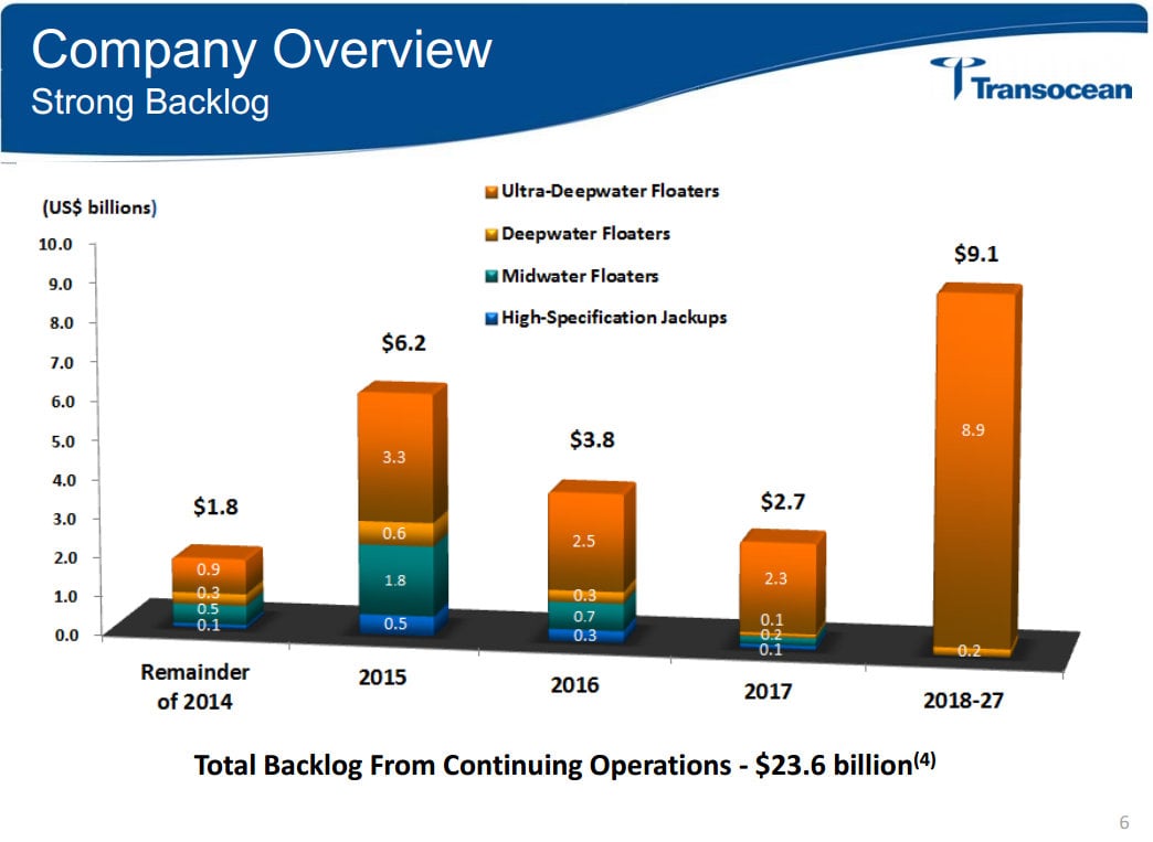 Transocean's current contract backlog stands at a very robust $23.6 billion. As the following slide notes the company's backlog is expected to provide it with $6.2 billion in revenue next year with solid revenue visibility for several years into the future.
