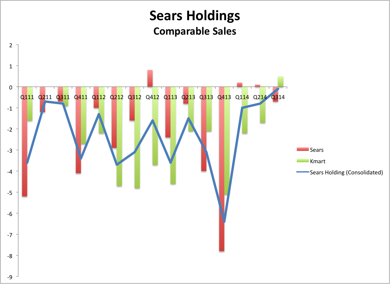 Same store sales fell 0.1%, yet another quarter in an unrelenting decline that's spanned years. They may have inched up 0.5% at Kmart in the third quarter, but it wasn't anywhere near enough to offset the 0.7% decline at Sears.