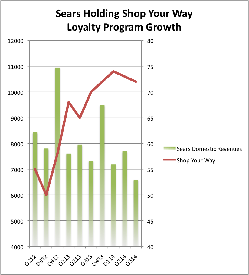 It has a fairly innovative loyalty member program called Shop Your Way, which accounts for 72% of eligible sales at Sears and Kmart, but the program seems to have topped out and may even be in decline. It also saps profits because it amounts to a double-discount for shoppers.