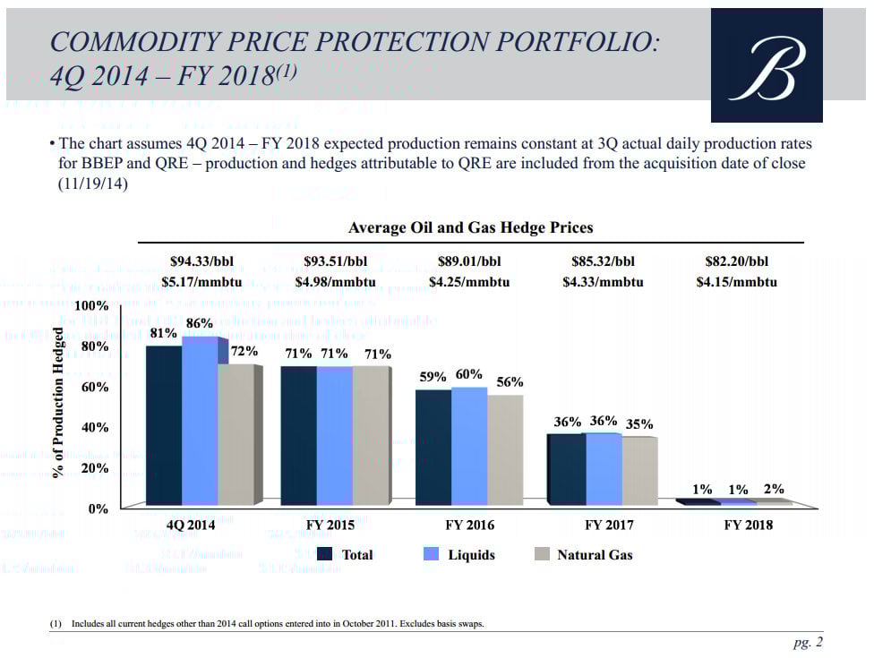 Before Jackson got to his history lesson he wanted everyone to know where the company stands as it enters the current crisis. The key thing he wanted everyone to keep in mind is that heading into the slump in oil prices BreitBurn Energy Partners is pretty well hedged, which will largely insulate it from the move in oil prices. We see this on the following slide where 71% of next year's production is hedged.