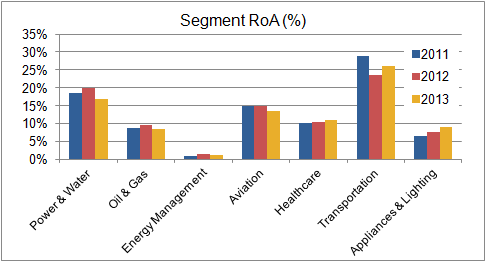 Turning to ROA, the following chart shows that the largest of the major segments, power and water, is also the most productive. (I will return to this point shortly.)
