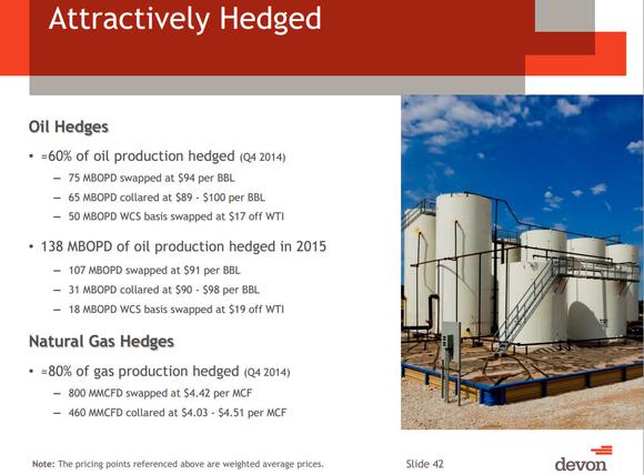 We find a similar story at most other oil companies. Production is largely hedged through 2015 and then it drops off heading into 2016 and beyond. Devon Energy (DVN 0.34%), for example, has 60% of its oil production hedged in the fourth quarter of this year as we see on the following slide.