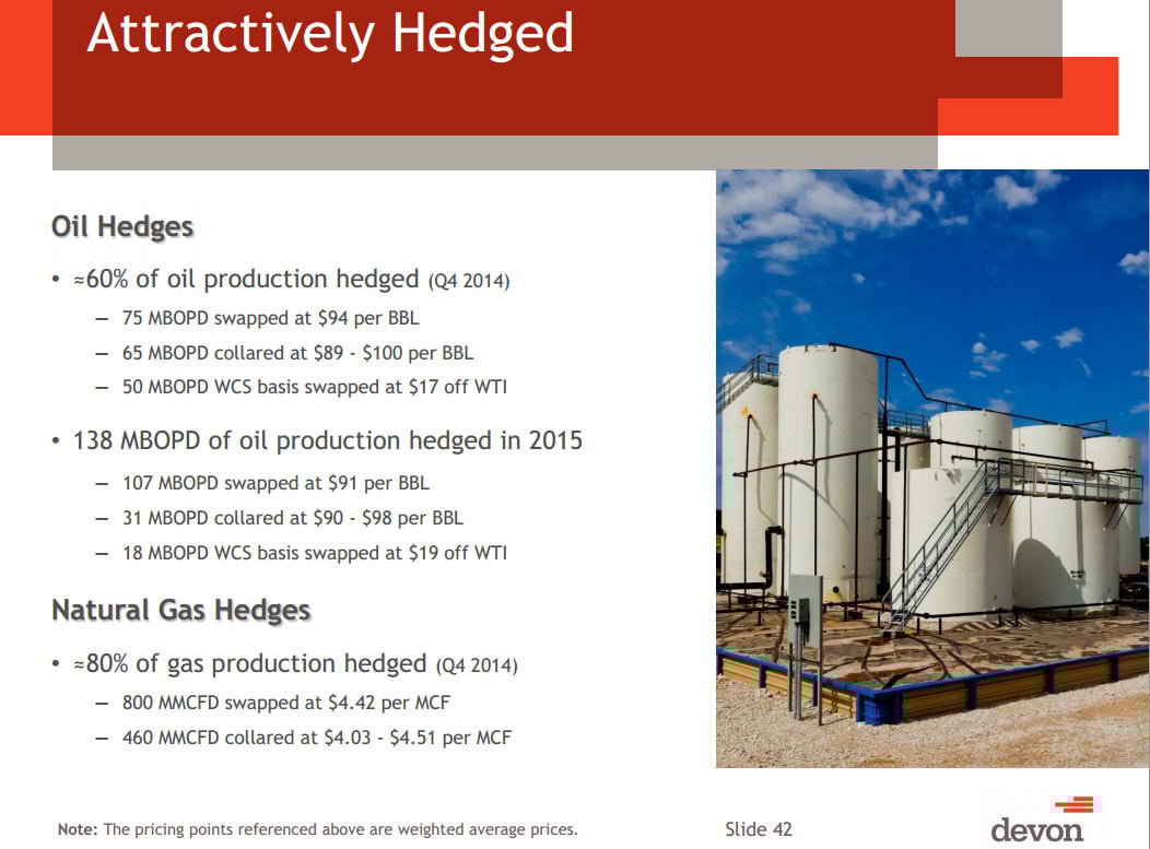 We find a similar story at most other oil companies. Production is largely hedged through 2015 and then it drops off heading into 2016 and beyond. Devon Energy (DVN 0.64%), for example, has 60% of its oil production hedged in the fourth quarter of this year as we see on the following slide.