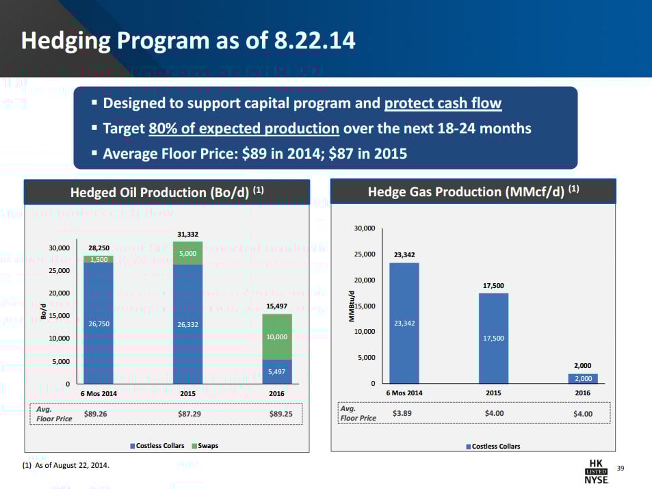 Depending on what hedging technique is used an oil company can lock in a fair amount of its cash flow for the year irrespective of what oil prices do. For example, Halcon Resources (HK +0.00%) has 80% of its production protected next year as we see on the following slide.