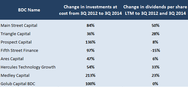 I went back through some of the leading BDCs' SEC filings to compare asset growth to dividend growth over the last two years. The table below shows the two-year change in investments at cost and dividends paid.