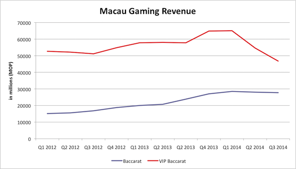 Nearly all of the drop in gaming in Macau comes from high rollers known as VIPs. These players use junkets to act as middlemen between gamblers and casinos, providing credit for gambling and making it easy to pay debts in China rather than in Macau. The setup made for easy money laundering; but when China's central government cracked down on corruption earlier this year, surely some of Macau's VIPs were on the target list.