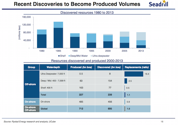 As you can see below, since 1980 a growing percentage of new reserves are coming from offshore. Last year, half of the new oil discovered was is in ultra-deepwater and more than three-quarters was at least mid to deepwater offshore. Considering the growing reserves and high replacement ratio, if we look out over the long-term, say, 5-10 years, the future of offshore drilling still looks bright.