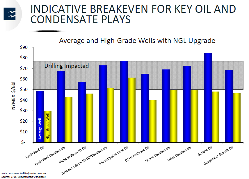 However, major advancements in the cost of shale development have significantly improved the economics for certain shale wells. Some of the best wells in certain shale basins can break even -- which is actually a 20% return on the well -- at as little as $30 per barrel.