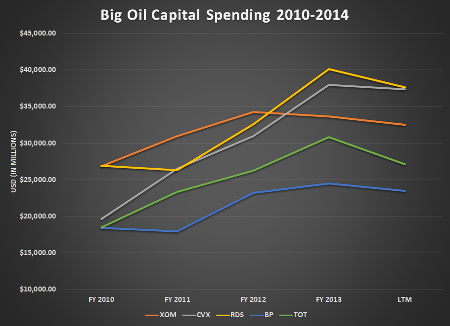 Among the main advantages the integrated majors have over smaller players in the space are the economics of scale and balance sheets that resemble an impenetrable fortress. Unlike many of the independents drilling shale wells in the U.S., which have junk bond status and are becoming less able to take on new debt, Big Oil could easily absorb that debt and roll it over into their better than credit-grade ratings without batting an eye. Also, based on the current ratio for some of these companies, it appears they all have some excess working capital on the books that could be used in an acquisition (a current ratio greater than one means a company has more liquid assets on the books to cover current liabilities).
