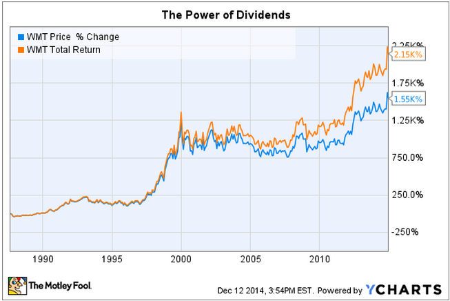 On Aug. 27, 1987, Wal-Mart (WMT +0.97%) paid its first cash dividend to shareholders. Since that date, a $1,000 investment in the company's stock -- based on its price alone -- is now worth $16,500.