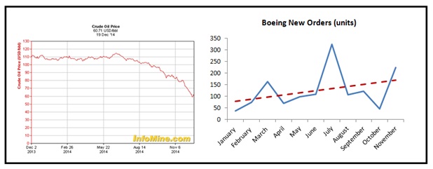 But the scenario has changed with the fall of prices in 2014, and in the first week of December, U.S. crude prices dropped to below $70/barrel for the first time in the last five years. Boeing's situation was aptly summed up by Morningstar analyst Neal Dihora in a KPLU article when he said, "You have to admit that lower oil is not good for somebody selling fuel-efficient airplanes."