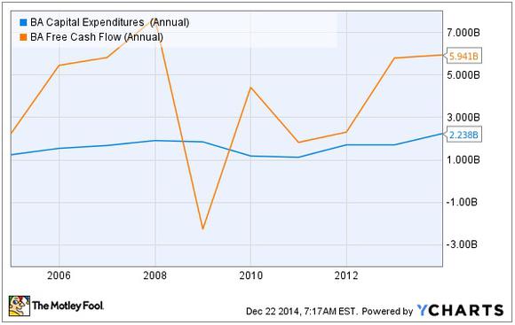 But a swelling order book has forced Boeing to gradually increase capital expenditures, from $1.7 billion in 2011 and 2012 to $2.1 billion last year. In the current fiscal year, the American aircraft manufacturer expects to pour in about $2.3 billion. Although this is not a significant increase from 2013, capex will keep increasing for a couple years as Boeing clears an order book that has crossed 5,500 units. Its book-to-bill ratio of more than one means new orders continue to surpass delivery numbers.
