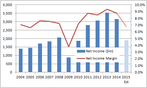 There are two things to note from the following chart. First, the trough in net income -- if that's what it turns out to be -- is a lot higher than $874 million recorded in 2009. Second, net income margin looks like it could be a lot higher during this trough.