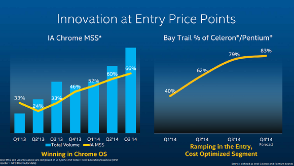 Over the course of 2014, Intel management had given various data points describing the mix profile of the company's PC chips. During the company's second quarter earnings call, CEO Brian Krzanich revealed that "over 60%" of the company's Pentium/Celeron processors sold were based on this architecture. He also noted that Bay Trail based systems made up "nearly 20%" of the company's notebook chip shipments.