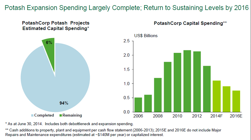 Another thing to consider, here, is that the company has been going through a major expansion program that has resulted in rather high capital expenditures for the past five years. Potash's management expects these expenditures to reduce even further as its new potash mine and other expansion programs come online.