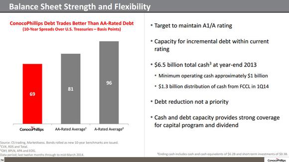 Meanwhile, ConocoPhillips' investment-rated balance sheet is rock solid -- so strong that the company could take on new debt without suffering a rating downgrade.